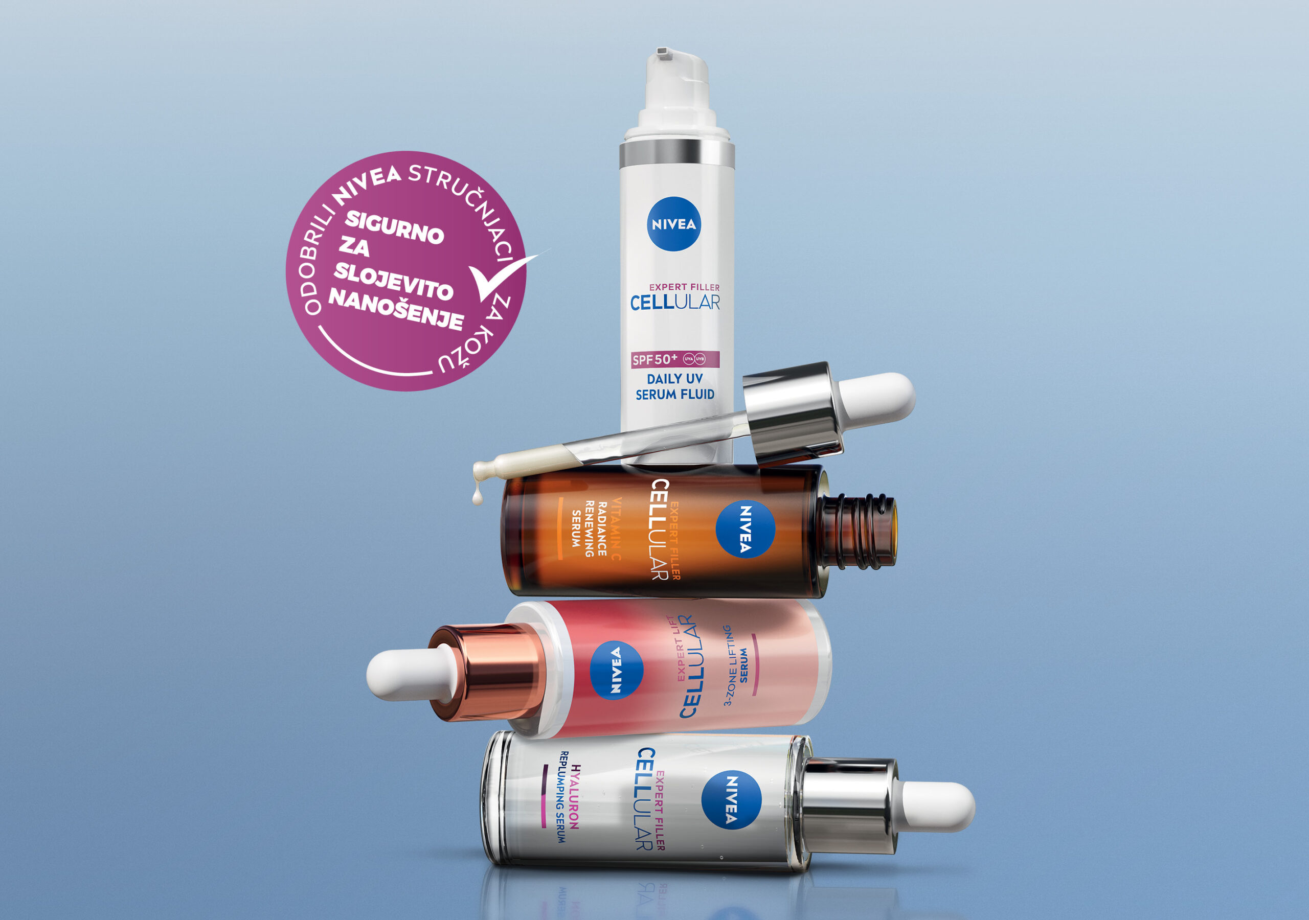 Ne brinite, kompatibilnost NIVEA CELLULAR Expert seruma klinički je testirana kako bi se osiguralo da se proizvodi međusobno usklađuju i ne izazivaju iritacije kože.
