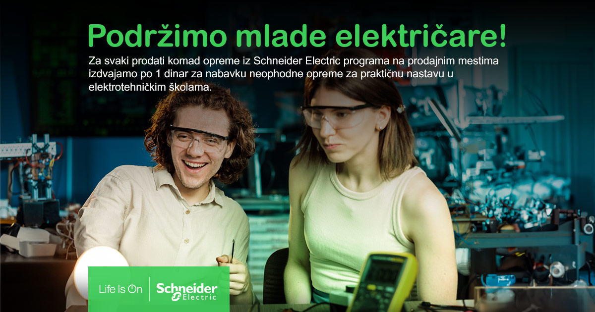 Schneider Electric predstavlja svoju najnoviju lokalnu inicijativu „Za mlade električare – pridruži se“. U okviru ove kampanje, za svaki prodati komad opreme iz Home and Distribution programa u elektroradnjama, izdvajaće se po 1 dinar. Prikupljena sredstva biće namenjena za nabavku opreme koja je neophodna za izvođenje praktične i teorijske nastave. Donacijom će biti obuhvaćene četiri elektrotehničke škole, i to Prva tehnička škola iz Kragujevca, Elektrotehnička škola „Nikola Tesla“ iz Niša, Srednja tehnička škola “Mihajlo Pupin” iz Kule i Elektrotehnička škola „Nikola Tesla“ iz Beograda.