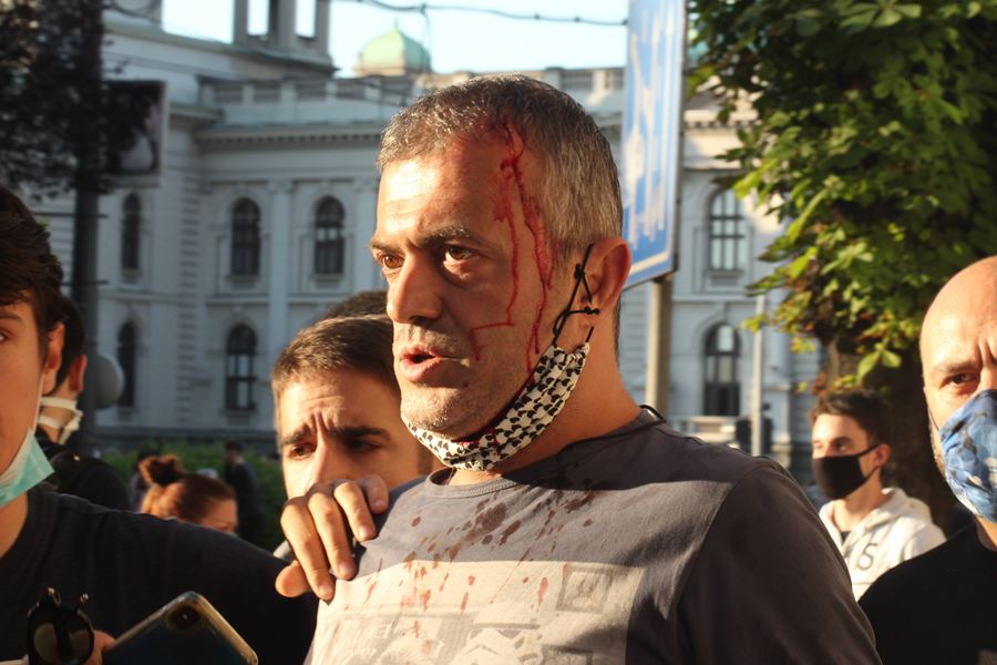 Juče sam napadnut bukvalno čim sam došao na protest. Izvadio sam telefon da snimim protest i tu se stvorila grupica likova koji su krenuli da me guraju, vuku. Ekipa iz Pokreta je tu doskočila, Pavle Grbović i Aca Radovanović su se tu stvorili i krenuli da me izvlače. Gađali su nas flašama, kamenjem, i u nekom trenutku me je neko udario fotoaparatom. I onda su nastale te fotke u kojoj je meni krvava glava. Mene kao glumca, hoće objektivi očito.
