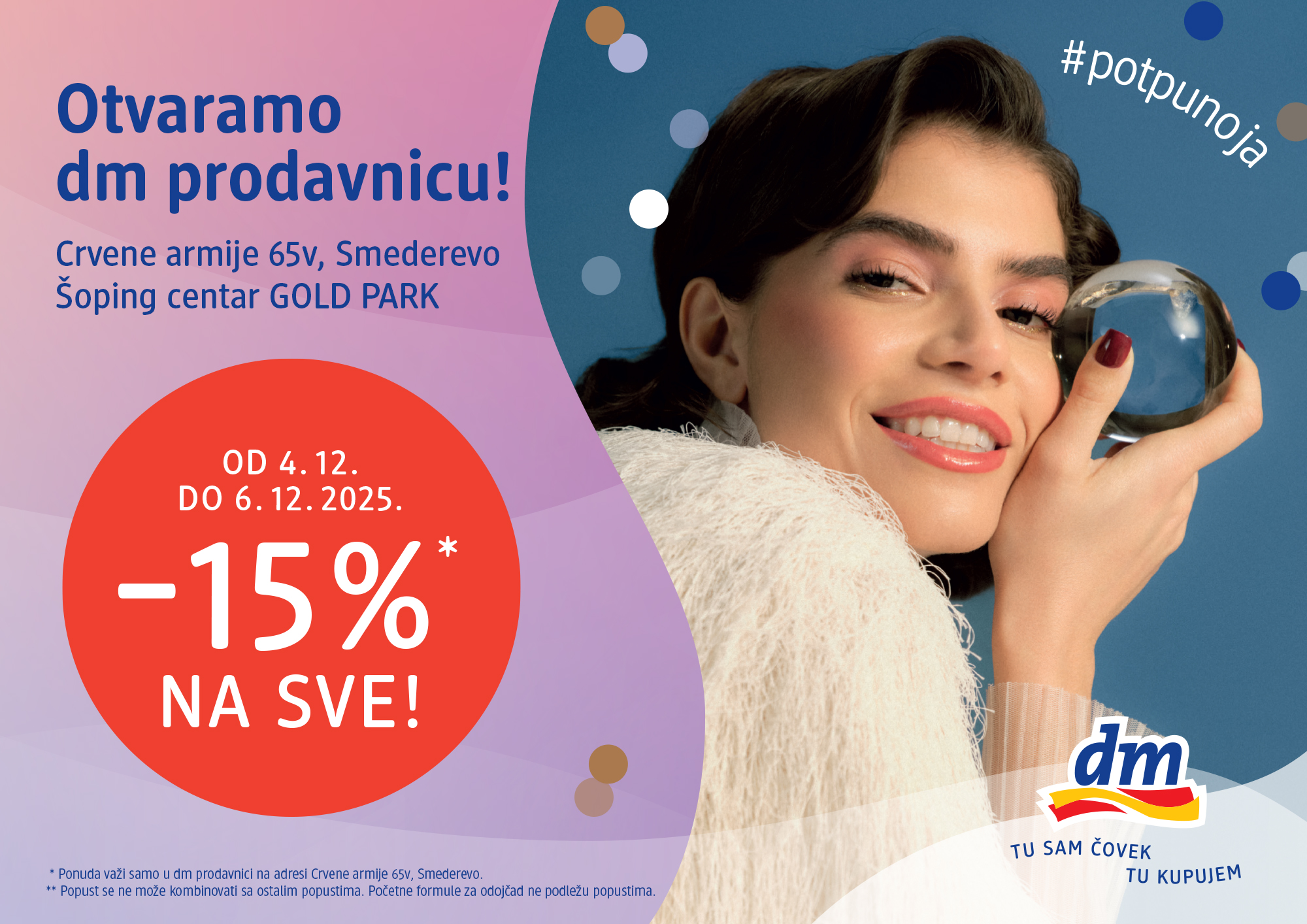 Pozivamo sve građane Smedereva da 4. decembra posete novootvorenu dm prodavnicu i otkriju svoje novo omiljeno mesto za inspirativnu i prijatnu kupovinu.