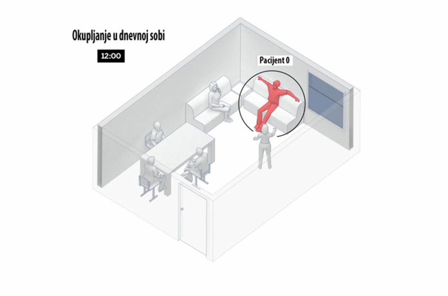 U izmišljenom kafiću nalazi se 15 gostiju i tri člana porodice. U varijanti u kojoj su zatvoreni prozori i nema provetravanja, i bez drugih mera čak 14 osoba će zaraditi virus nakon četiri sata.