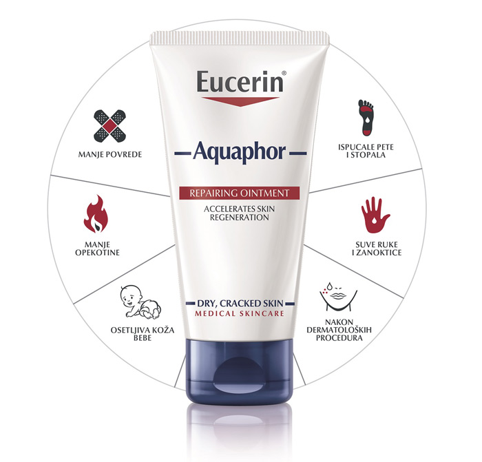 Nežna prema koži, bez konzervansa i parfema, Eucerin®Aquaphor regenerativna mast idealna je za lokalizovanu, ciljanu upotrebu bilo da su u pitanju manje ili veće površine kože.