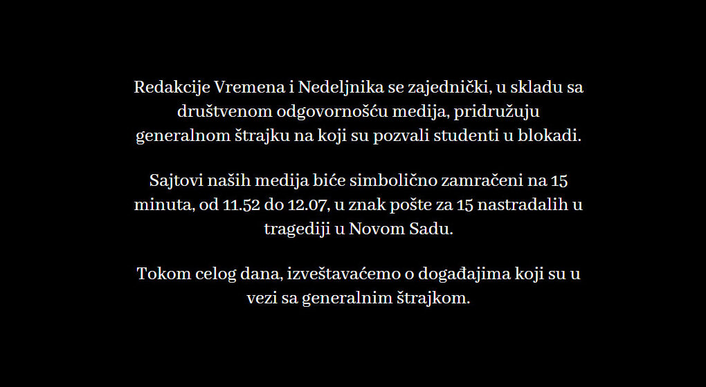Redakcije Vremena i Nedeljnika se zajednički, u skladu sa društvenom odgovornošću medija, pridružuju generalnom štrajku na koji su pozvali studenti u blokadi.