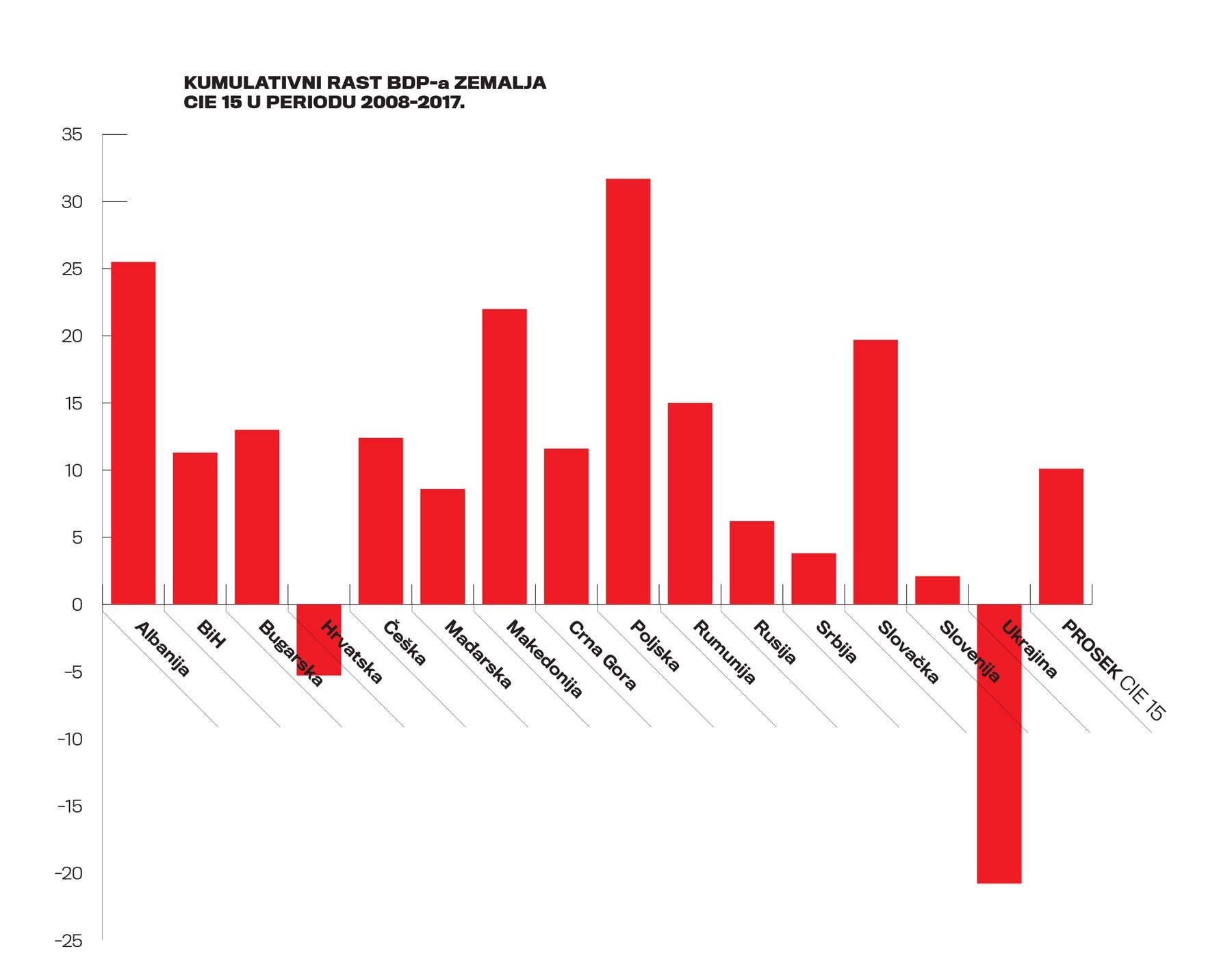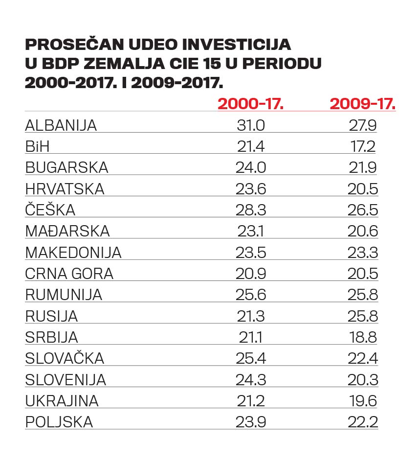 U pokušaju da utvrdimo razlog zaostajanja Srbije za većinom drugih zemalja Centralne i Istočne Evrope, koje su takođe imale neku vrstu realsocijalizma i relativno uspešno prebrodile poslednje skoro tri decenije, analizirali smo tendencije glavnog ekonomskog pokazatelja: BDP-a i njegovog glavnog generatora: (fiksnih) investicija. Prvo, na osnovu baze podataka MMF-a izračunali smo prosečne stope rasta u drugoj polovini poslednje decenije 20. stoleća za svih 15 odabranih zemalja (CIE 15). Posle toga izračunali smo (diskretne) prosečne stope rasta za period 2000–2017, pretkrizni (sub)period 2000–2008, i razdoblje od izbijanja krize (krajem 2008) do danas. Prosečno učešće investicija u BDP-u izračunavali smo za celi period koji počinje 2000, kao i za (sub)period od početka 2009. do kraja 2017. Izabrali smo skoro sve evropske zemlje u tranziciji, isključujući one relativno male i nama daleke (države Baltika, Moldavija), ili one koje nisu imale značajne reforme, poput Belorusije.