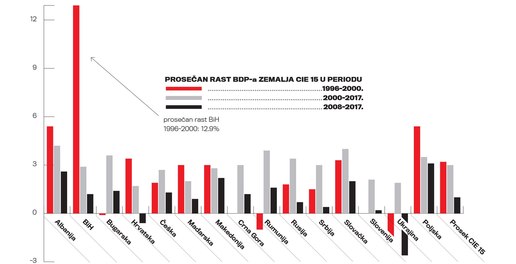 Istina, srpska privreda je ostvarila prosečan rast u periodu 2000–2017. od 3%, što je praktično identično prosečnom rastu za svih 15 posmatranih zemalja, ali je niska baza nasleđena iz devedesetih od fundamentalnog značaja za razumevanje niskog nivoa današnjeg BDP-a po glavi stanovnika Srbije. Pored toga, nizak nivo fiksnih investicija u BDP-u tokom čitavog perioda počevši od 2000. (skromnih 21,1% BDP-a, naspram prosečnog udela za CIE od 23,9%), a posebno u drugom potperiodu počev od 2009. godine (18,8%, naspram 22,2%), doprineo je relativno sporom ekonomskom rastu. S obzirom na nedovoljan stepen razvoja Srbije, a time i slab potencijal za veći rast, ono što je postignuto od 5. oktobra 2000. do danas svakako je obeshrabrujuće i, po svemu sudeći, ukazuje na strukturni problem srpskog ekonomskog i političkog miljea.