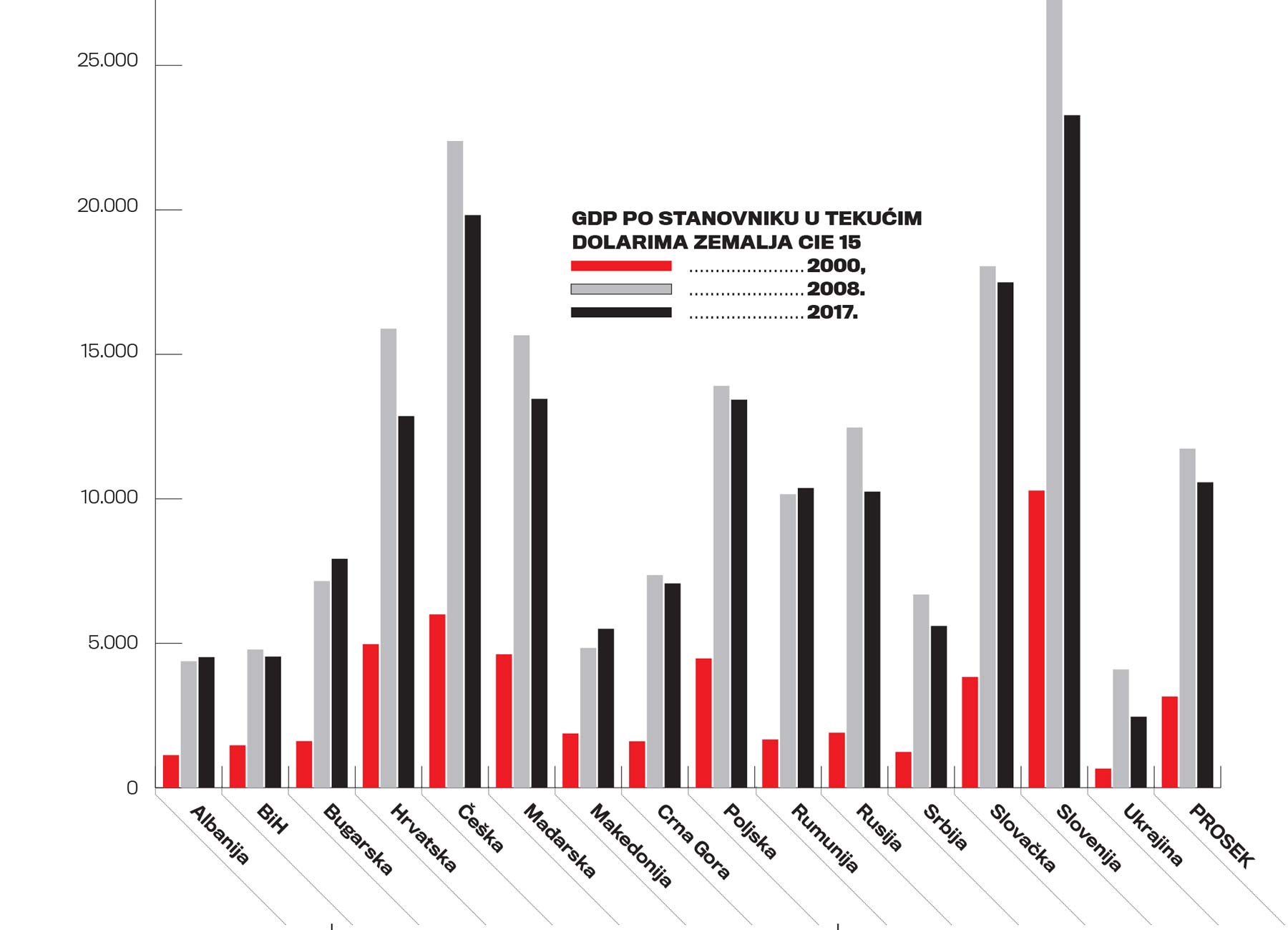 Srbija je jedna od malog broja zemalja u tranziciji čiji je BDP manji u poređenju sa periodom pre tranzicije. BDP Srbije u 2017. je za oko petinu niži nego 1989, dok su ostale zemlje u tranziciji u istom periodu u proseku povećale BDP za oko dve trećine. Kao rezultat ove divergencije, BDP po stanovniku zemalja CIE 15 u 2017. veći je od srpskog skoro duplo (tačnije za 89%, dok je razlika posmatrajući BDP po kupovnoj moći manje drastična: CIE 15 bolje su od nas za 48%), dok je u 1989. godini BDP pc za sve pomenute zemlje (u proseku) i Srbiju bio približno jednak.