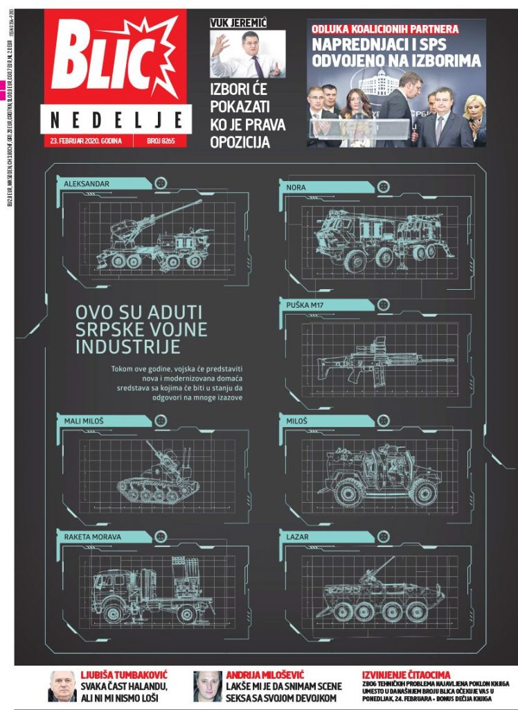 BLIC – „Naprednjaci i SPS idu odvojeno na izborima“, o dogovoru Srpske napredne stranke i Socijalističke partije Srbije. Intervju sa predsednikom Narodne stranke Vukom Jeremićem list najavljuje naslovom „Izbori će pokazati ko je prava opozicija“. Tekst „Ovo su aduti srpske vojne industrije“, govori o oružju koje proizvodi Srbija.