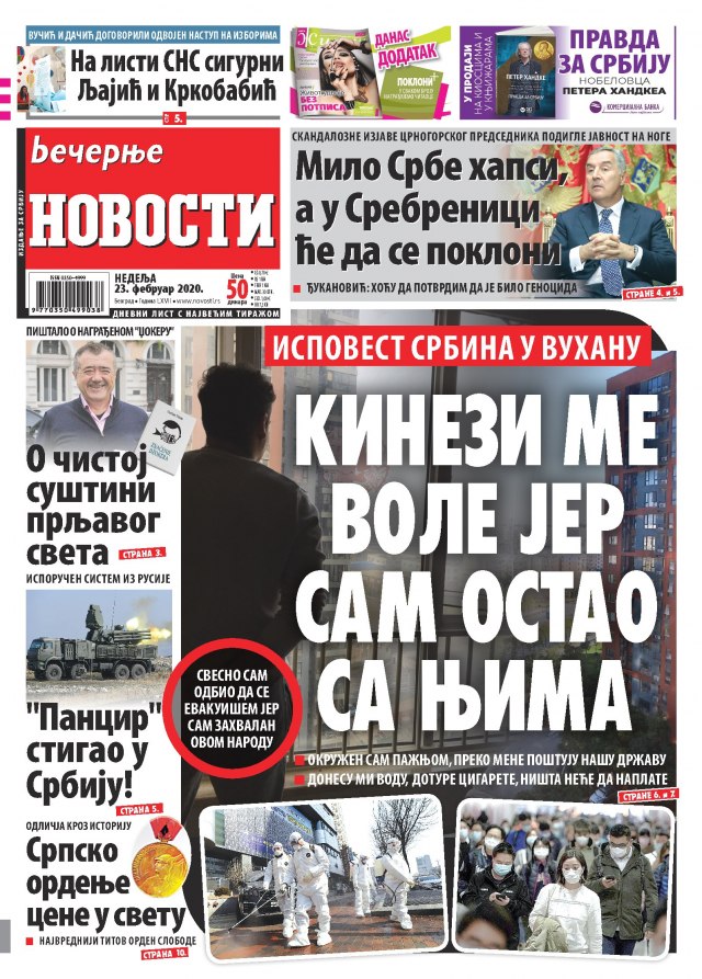 VEČERNJE NOVOSTI – Pod naslovom „Kinezi me vole jer sam ostao sa njima“ donosi razgovor sa Srbijom koji je odbio da se evakuiše iz Vuhana jer je zahvalan kineskom narodu. „Pancir stigao u Srbiju“, da je stigao provavionski sistem iz Rusije.