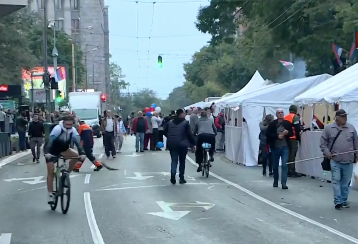 Beli šatori, koji su postavljeni na toj lokaciji još jutros, za sada su ipak ostali u jednoj saobraćajnoj traci, u smeru ka raskrsnici sa Kneza Miloša.
