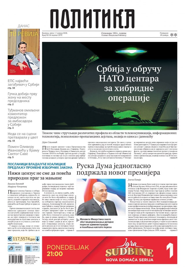 POSLANICI POTVRDILI DA JE MIŠUSTIN NOVI PREMIJER RUSIJE -Poslanici donjeg doma ruskog parlamenta izabrali su Mihaila Mišustina za novog premijera, manje od 24 časa nakon što ga je predsednik Vladimir Putin nominovao za tu funkciju. U prvom obraćanju, Mišustin je obećao da će se fokusirati na socijalna pitanja i poboljšanje životnog standarda građana.