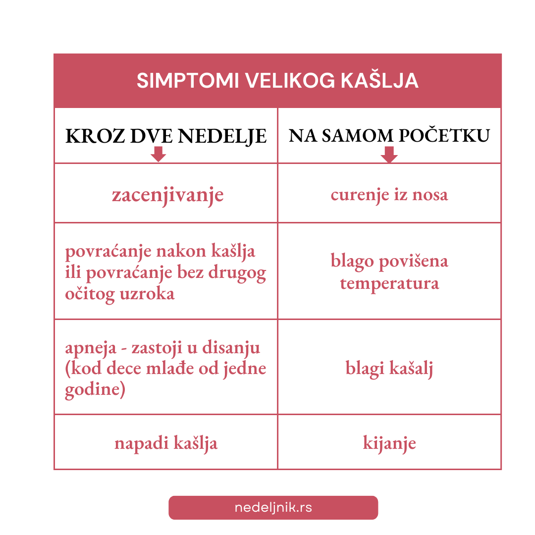 Vakcinacija je obavezna u Srbiji, zakonski gledano, a proces (od tri doze) treba da otpočne u drugom mesecu života bebe, nakon čega sledi revakcinacija u drugoj godini. To je zaštita za najmlađe i najugroženije, kojima vrlo često upravo odrasli prenose bolest. Zbog toga se u nekim zemljama savetuje vakcinacija trudnica u poslednjem trimestru trudnoće, ali i ljudi koji će biti u okruženju kada se beba rodi. U Srbiji je ovo tek na nivou pomena, ali prakse drugih možda posluže kao dobar primer.