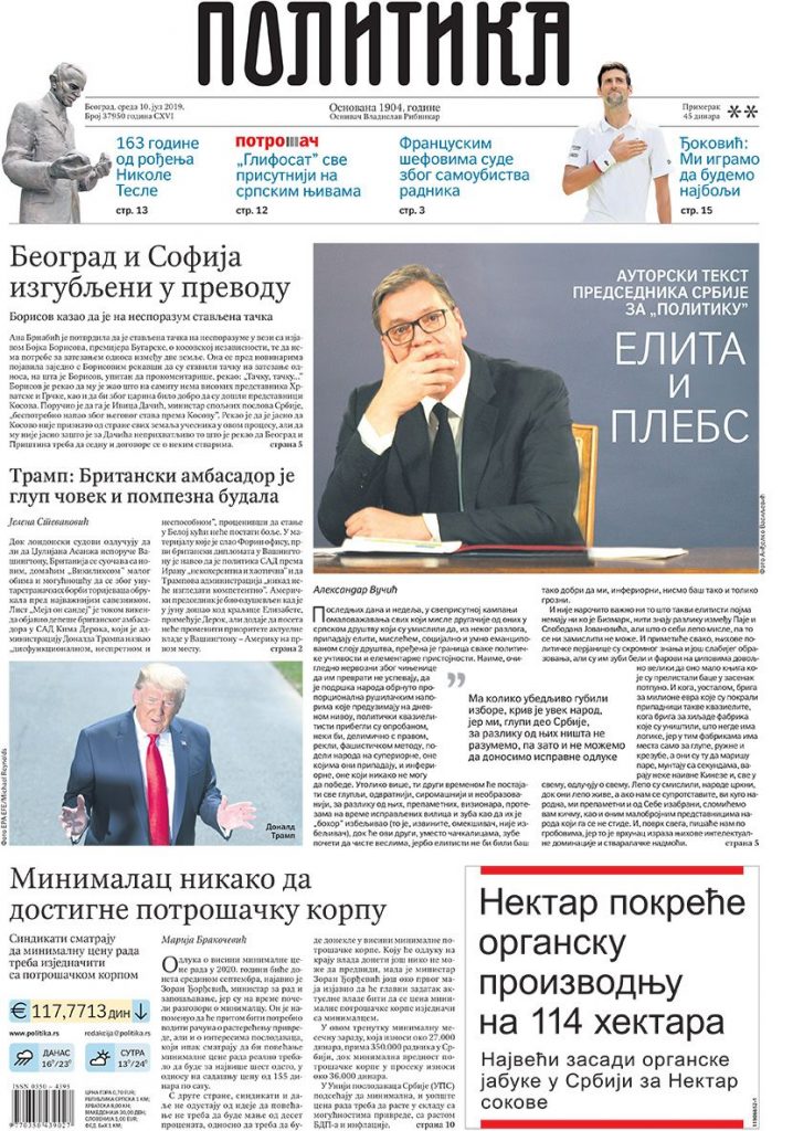 PREDSEDNIK SRBIJE O ELITI I DIPLOMAMA – Pređena je svaka granica učtivosti i elementarne pristojnosti u sveprisutnoj kampanji omalovažavanja svih koji misle drugačije od onih koji su umislili da pripadaju eliti, ocenio je u autorskom tekstu za Politiku predsednik Srbije Aleksandar Vučić. Dodaje da elita posebno „sladostrašće“ pokazuje baveći se diplomama jer „koga je briga za znanje“.