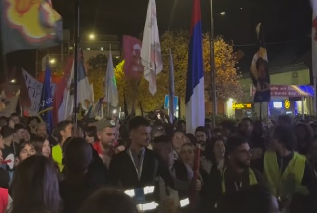 Studenti, srednjoškolci i drugi građani koji pešače dočekani su u špaliru, sa nekoliko zapaljenih baklji.