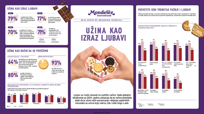 Kompanija Mondelēz International, Inc. (Nasdaq: MDLZ) objavila je nova saznanja o povezanosti samog koncepta užine sa oblikom iskazivanja ljubavi u svom šestom godišnjem State of Snacking™ izveštaju – globalnoj studiji o potrošačkim trendovima, koja na godišnjem nivou pruža uvid u to kako potrošači donose odluku o užini. Rezultati istraživanja pokazuju da se 71% potrošača na globalnom nivou slaže da deljenje užine sa drugima jeste svojevrstan izraz ljubavi.