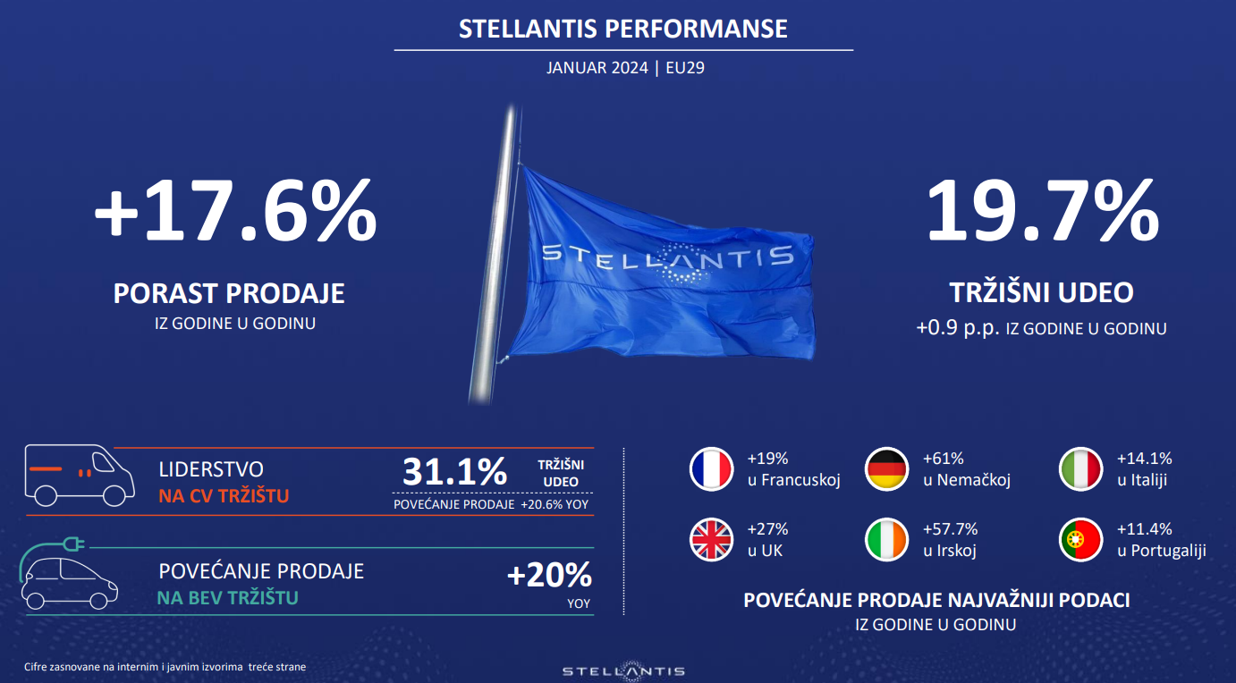 - Stellantis premašuje pozitivan trend iz 2023. na evropskom (EU29) rangiranju ukupne prodaje na tržištu, rastući u januaru i po tržišnom udelu (19,7%, + 0,9 procentnih poena u odnosu na prošlu godinu) i po količinama (+17,6%)
