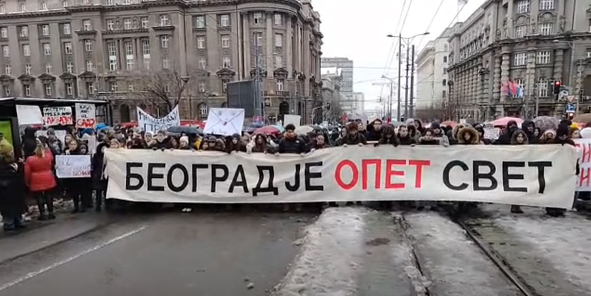 Nakon petnaestominutnog odavanja pošte stradalima prilikom pada nadstrešnice u Novom Sadu na više lokacija u gradu, studenti su se zajednički uputili ka Ministarstvu, sakndirajući usput parole studentskih protesta.