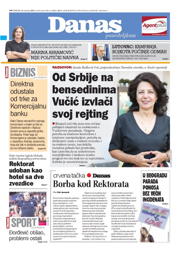 ODRŽANA PARADA PONOSA U BEOGRADU – U Beogradu je juče održana Parada ponosa pod parolom „Ne odričem se“. Nakon šetnje, organizovana je žurka u parku Manjež. Prajdu je prisustvovala i premijerka Srbije Ana Brnabić. Kolona Parade ponosa bez incidenata je prošla pored mesta gde su se nalazili protivnici, na uglu Takovske i Bulevara kralja Aleksandra.