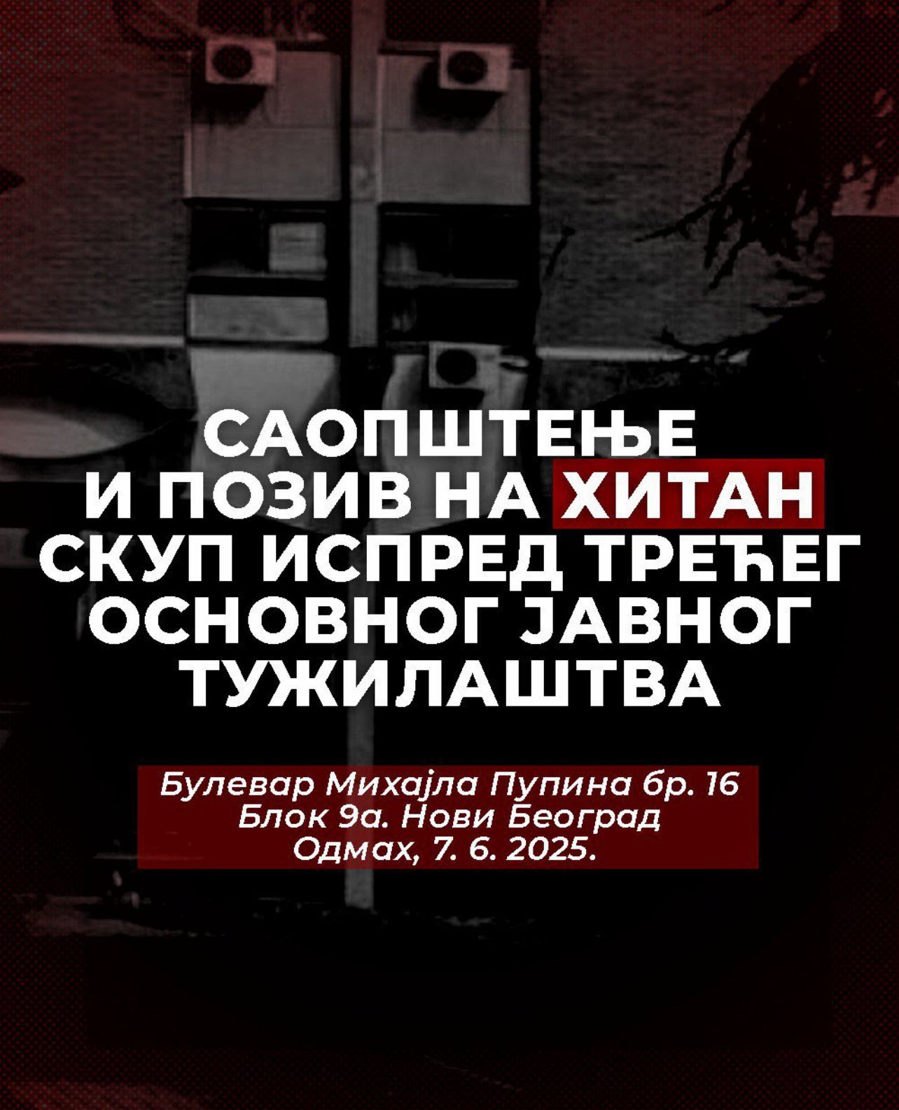 Studenti u blokadi su na društvenoj mreži „X“ pozvali na hitan skup ispred Trećeg osnovnog javnog tužilaštva na Novom Beogradu zbog, kako su naveli, „nezakonito prosleđenih snimaka režimskim medijima“.
