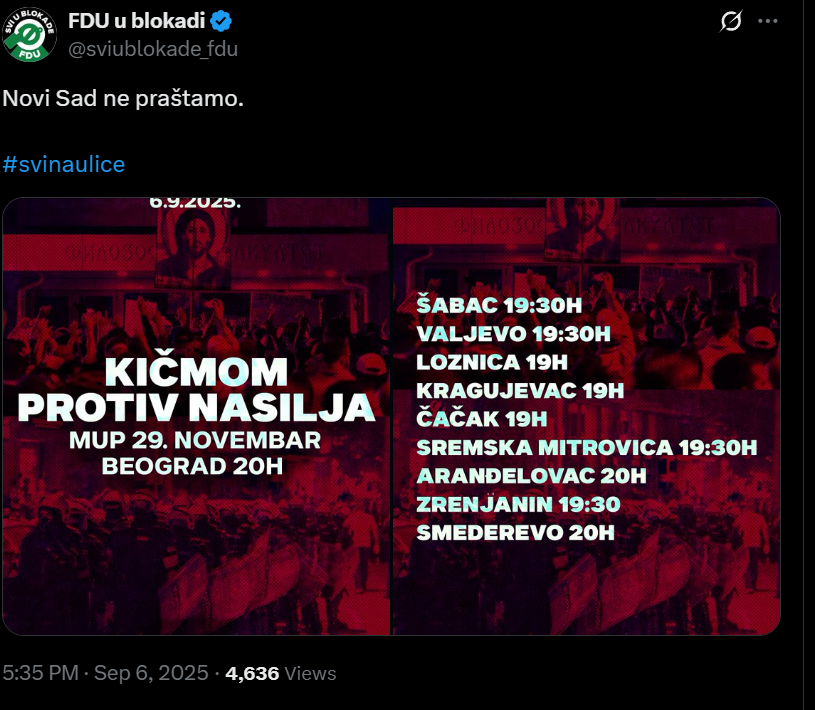 U više gradova Srbije večeras će biti održani protesti zbog sinoćne policijske brutalnosti u Novom Sadu, objavili su studenti FDU.