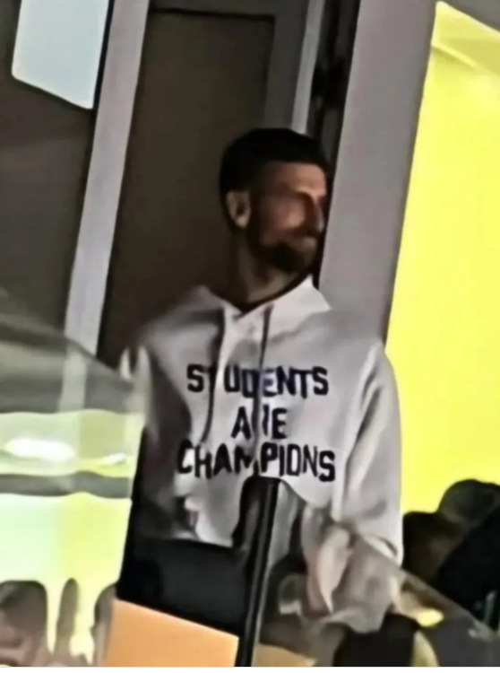 Nova Đoković pojavio se večeras u „Beogradskoj areni“ pred početak „večitog derbija“ Partizan – Crvena zvezda u duksu na kome je ispisano – „Students Are Champions“.