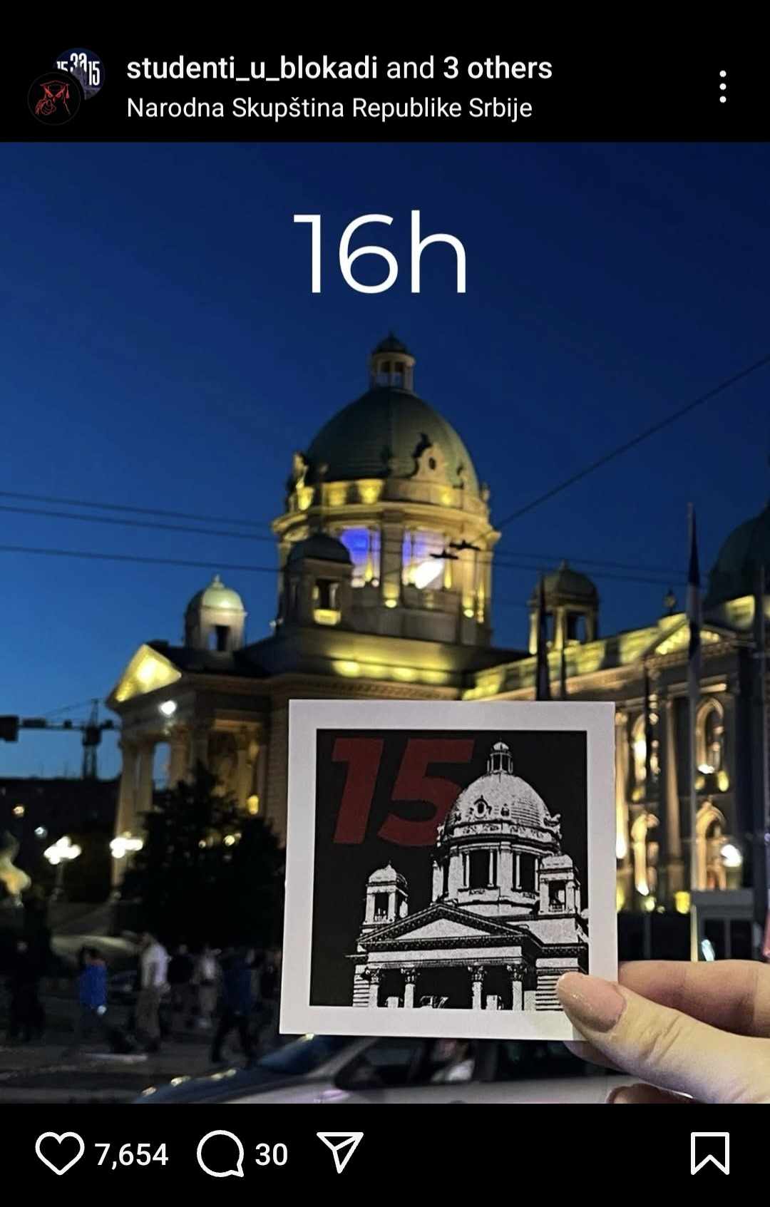 Studenti u blokadi objavili su na svojoj Instagram stranici da će sutrašnji protest u Beogradu početi u 16 sati ispred Skupštine Srbije.