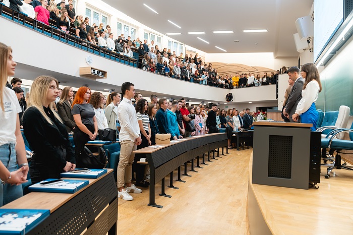 Prof. dr Saša Ranđelović, prodekan za finansije i međunarodnu saradnju uputio je nove studente u EFMD programsku akreditaciju koju ima fakultet prvi i jedini u Srbiji iz oblasti ekonomije i biznisa. ,,Imamo 6 studijskih programa na engleskom jeziku, stipendiranu međunarodnu mobilnost studenata, akreditaciju ACCA koja podrazumeva usklađenost studija sa svim zahtevima svetskog tržišta rada u oblasti finansija. Sve što radimo ima za cilj da budemo ponosni na vas, a vi na vaše diplome“ uputio je poruku studentima profesor Ranđelović.