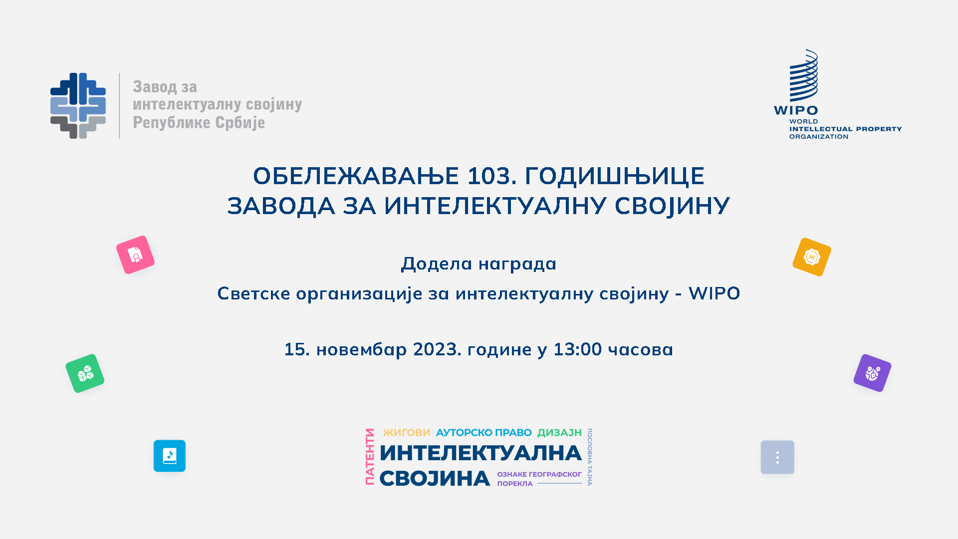 U sredu, 15. novembra u 13 časova u Malom pozorištu „Duško Radović” u Beogradu, povodom obeležavanja 103. godišnjice od osnivanja Zavoda za intelektualnu svojinu biće dodeljene nagrade pobednicima takmičenja Svetske organizacije za intelektualnu svojinu (WIPO) za 2023. godinu – WIPO National Awards. Prisutnima će se obratiti Vladimir Marić, direktor Zavoda za intelektualnu svojinu, kao i predstavnici Ministastva privrede i Ministarstva nauke, tehnološkog razvoja i inovacija.