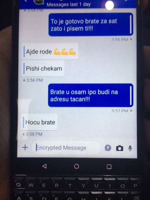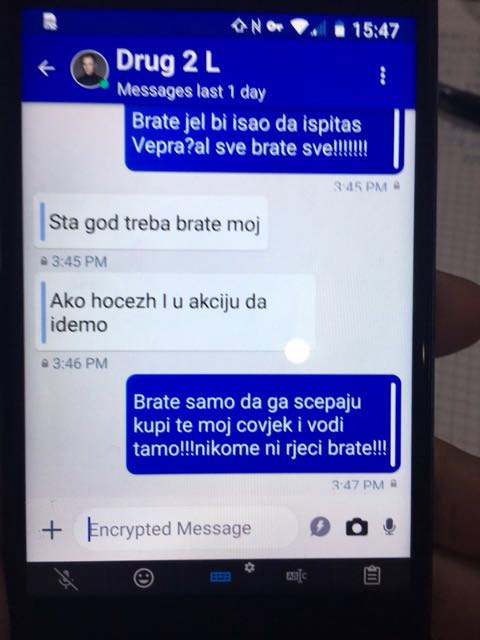„14.10.2020. u 21:37:29 časova, Veljko Belivuk: evo pošto ne mogu da vas imam na kripti, ne smem, jer ovaj telefon nije naš, samo da vas pozdravim puno braćo, da se zahvalim svima, bez …. ne znam kako se izgovara to, prenesite nam utiske molim vas, znači dajte nam malo da nahranimo ego, umorni smo, prljavi smo, smrdimo, znači haos“.