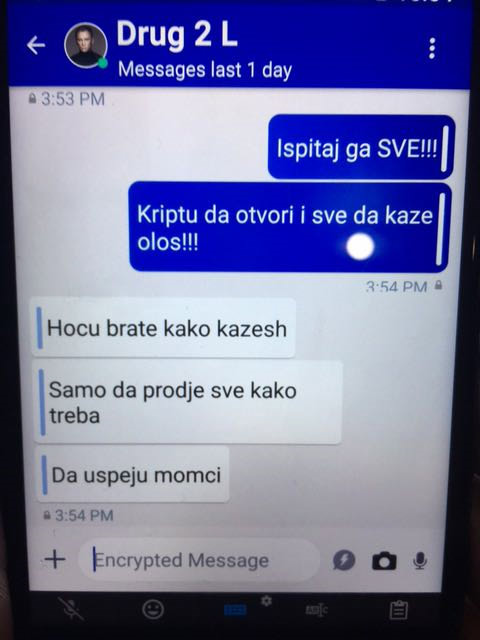 „Iz isprava koje su dobijene putem međunarodne pravne pomoći od 14.10.2020 u čet grupi: Miloš Budimir, Lalić Srđan, Hrvatin Bojan, Marko Budimir, Marko Miljković, Tešić Dejan, Marko Miljković na ovu grupu šalje 4 slike na kojima su slikani ekrani prepiske Lazara Vukićevića i Mileta Radulovića na kojima je vidljivo da Lazar Vukićević ide da ispituje Vepra (Veljko Belivuk)“.