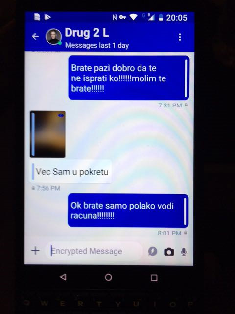 „u 18:06:40 časova, Miloš Budimir: Braćo samo ću da promenim ime grupi zbog Tajsona dok bude vozio ovog da ne vide slučajno mislim ne bi trebalo al da ne bi videli“.
