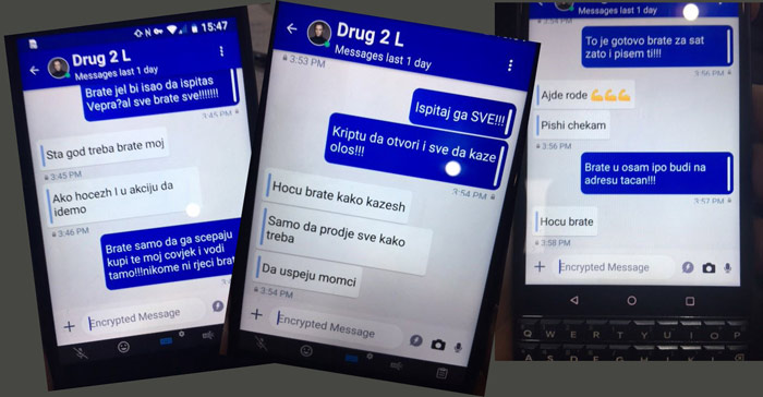 „14.10.2020. u 18:53:12 časova, APARAT MARKA BUDIMIRA A KORISTI BOJAN HRVATIN: A brate slušaj Tajsonu ne stižu poruke zato što smo stavili onu foliju, onu onu torbicu Barijevu smo stavili burazeru i Lazin telefon i od ovog, znaš sve profi brate, sve onako ono ide se na tajno mesto, ovako onako, razumeš, da ne može da kuca, da ne može nikakve lokacije da prijavljuje i to, tako da znaš“.