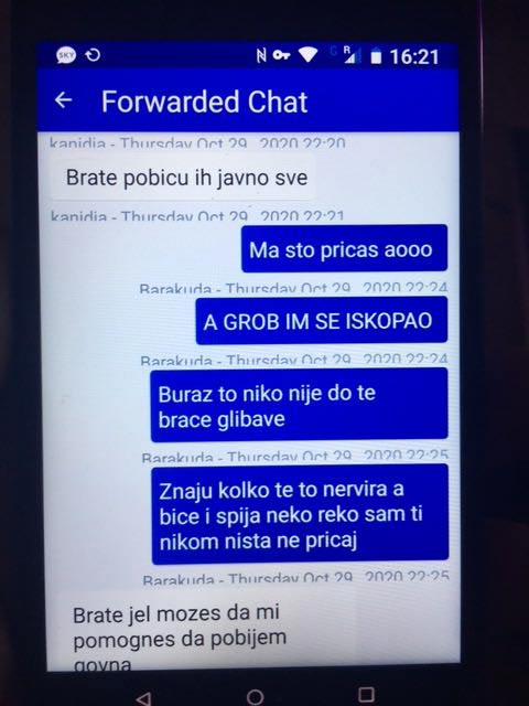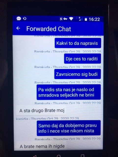 „Vreme:15:21:54 do 15:22:58 NN lice na ovu grupu šalje set slika na kome su slikane poruke razmenjene između Zdravka Radojevića i NN lica iz kojih je vidljivo da Zdravko preti smrću grupi Veljka Belivuka“.