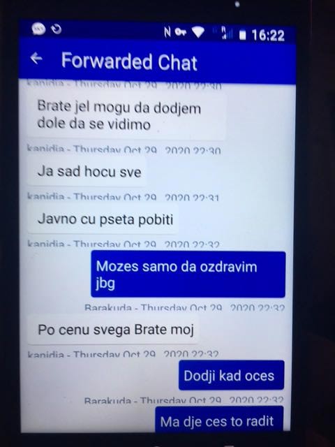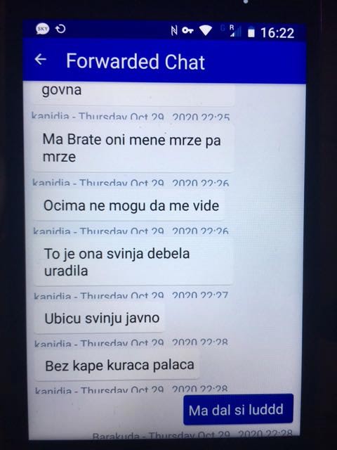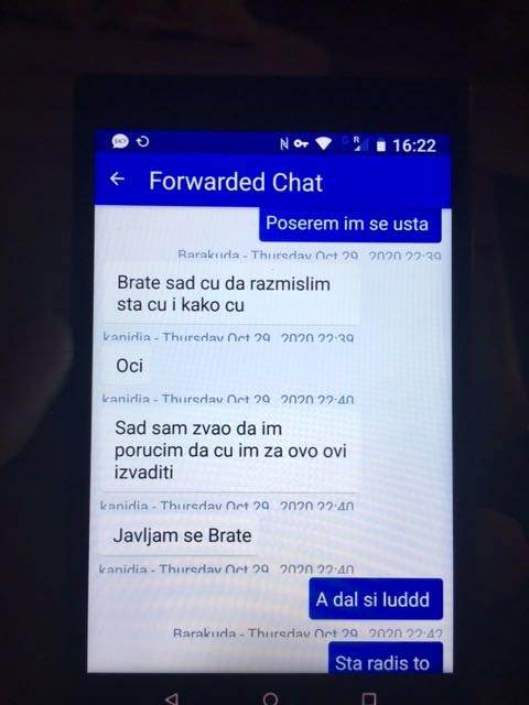 „15:19:55 glasovna poruka: Čipi: pa brate u izjavi piše da su došli sa maskama, da ti ne znaš ko su i da su ti tražili saobraćajnu i ključeve, ne zajebavaj, čitamo izjavu