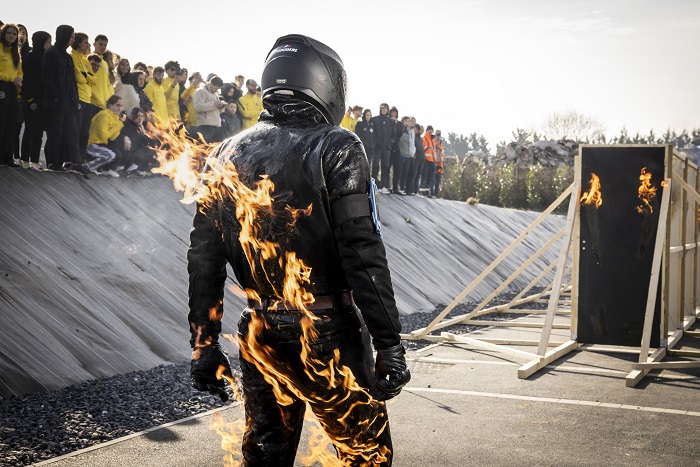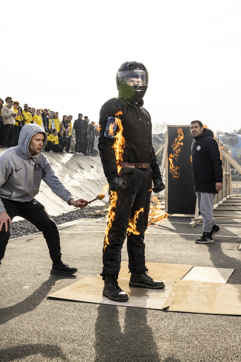 Kaskader Renaud Favero iz CUC-a hrabro je prošao kroz šest uzastopnih plamenih vrata, dok je i sam bio u plamenu, savladavši izazov za manje od sedam sekundi. Svaki plameni portal, dimenzija 210 cm x 90 cm x 4 cm, bio je postavljen dva metra jedan od drugog, čineći svaki prolaz izuzetno zahtevnim. S obzirom na to da je imao samo pet sekundi da prođe kroz svaki od njih, Faverova preciznost, brzina i izdržljivost su bili stavljeni na test.
