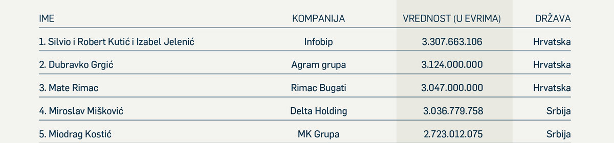 Najbogatiji ljudi u regionu su vlasnici hrvatske IT kompanije Infobip – Silvio i Robert Kutić i Izabel Jelenić. Vrednost njihove kompanije za godinu dana uvećala se skoro 807,6 miliona evra (malo više od te sume vredi kompanija najbogatijeg bosansko-hercegovačkog biznismena)