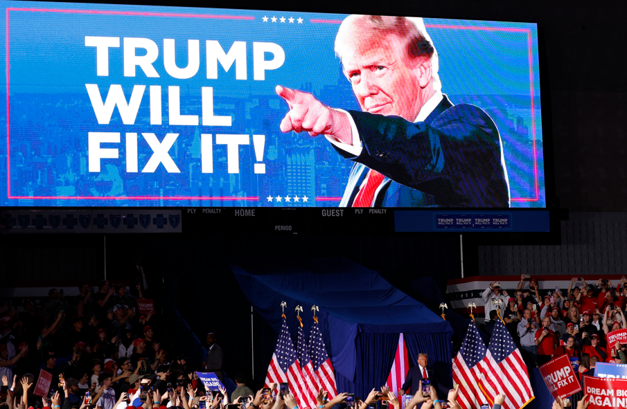 Publika se okupila ispred bine, formirajući more crvenih kačketa. Među njima se izdvajao Blejk Marnel, redovni učesnik mitinga, u odelu koje simbolizuje Trampov zid. Držao je telefon sa natpisom „Tramp će pobediti!“ dok je jedan muškarac na svom telefonu proveravao rezultate iz New York Times-a.