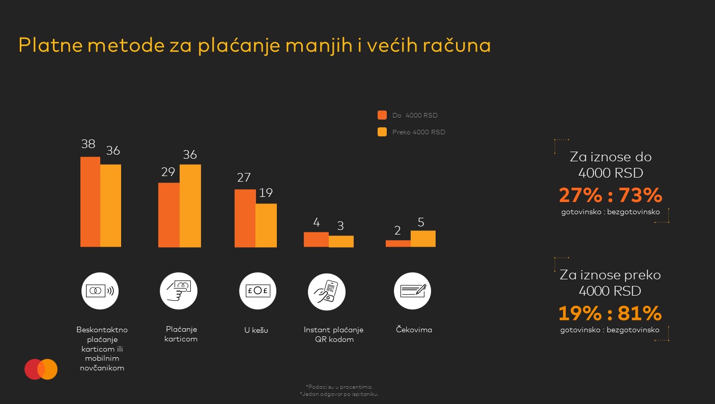 Gledajući visinu računa, bezgotovinska plaćanja su primarna platna opcija kako za manje, tako i za veće iznose – za račune do 4.000 dinara, 71% ispitanika se opredeljuje za bezgotovinske opcije (kartice, mobilni novčanici, instant plaćanja), a još je veći procenat njih – 76% – koji to rade za iznose preko 4.000 RSD.