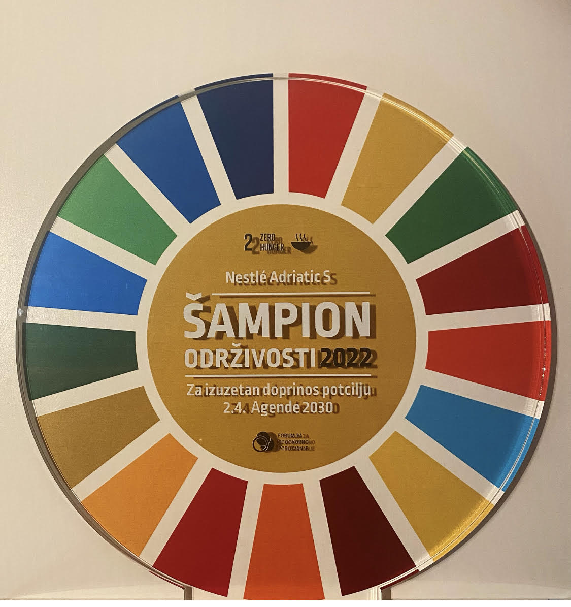 Takođe, u okviru godišnjeg CSR&ESG Foruma u organizaciji Smart kolektiva i Foruma za odgovorno poslovanje, i projekta „Održivi razvoj za sve“, Nestlé Srbija osvojio je titulu „Šampiona održivosti“ za uspešnu implementaciju principa globalnog programa regenerativne poljoprivrede u Srbiji, kojima se čuva i obnavlja zemljište za buduće generacije, štiti životna sredina i pruža podrška domaćoj ekonomiji. Ova priznanja dodeljuju se kompanijama koje se u svom poslovanju i strategijama pridržavaju Ciljeva održivog razvoja sadržanih u Agendi 2030 Ujedinjenih nacija i pružaju aktivan doprinos njihovom ostvarenju.