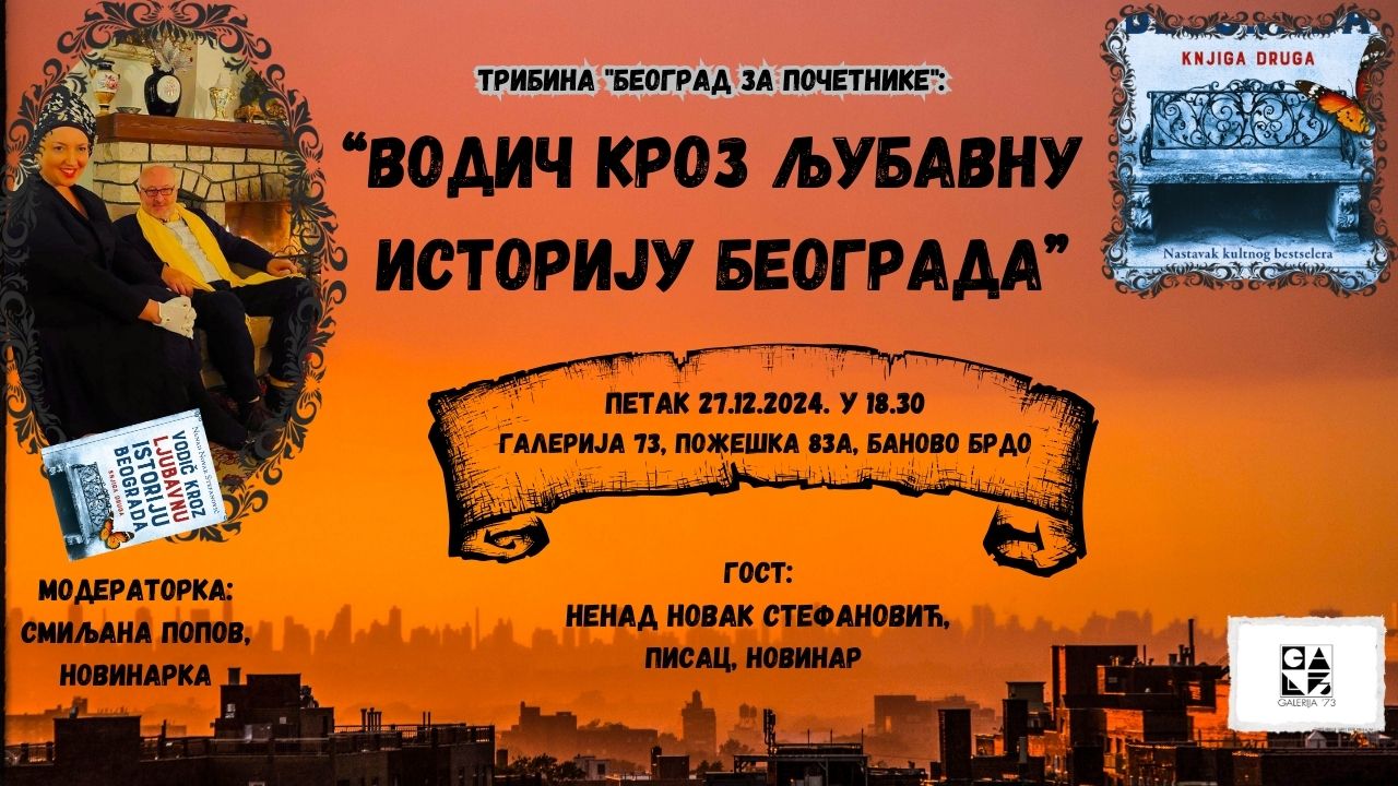 Pridružite se Nenadu Novaku Stefanoviću, autoru novog “Vodiča kroz ljubavnu istoriju Beograda” (nastavku kultnog bestselera) u ovom literarnom vremeplovu i otkrijte ljubavne tajne naše prestonice koje će u petak 27.12. u 18.30h otkriti