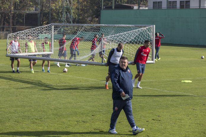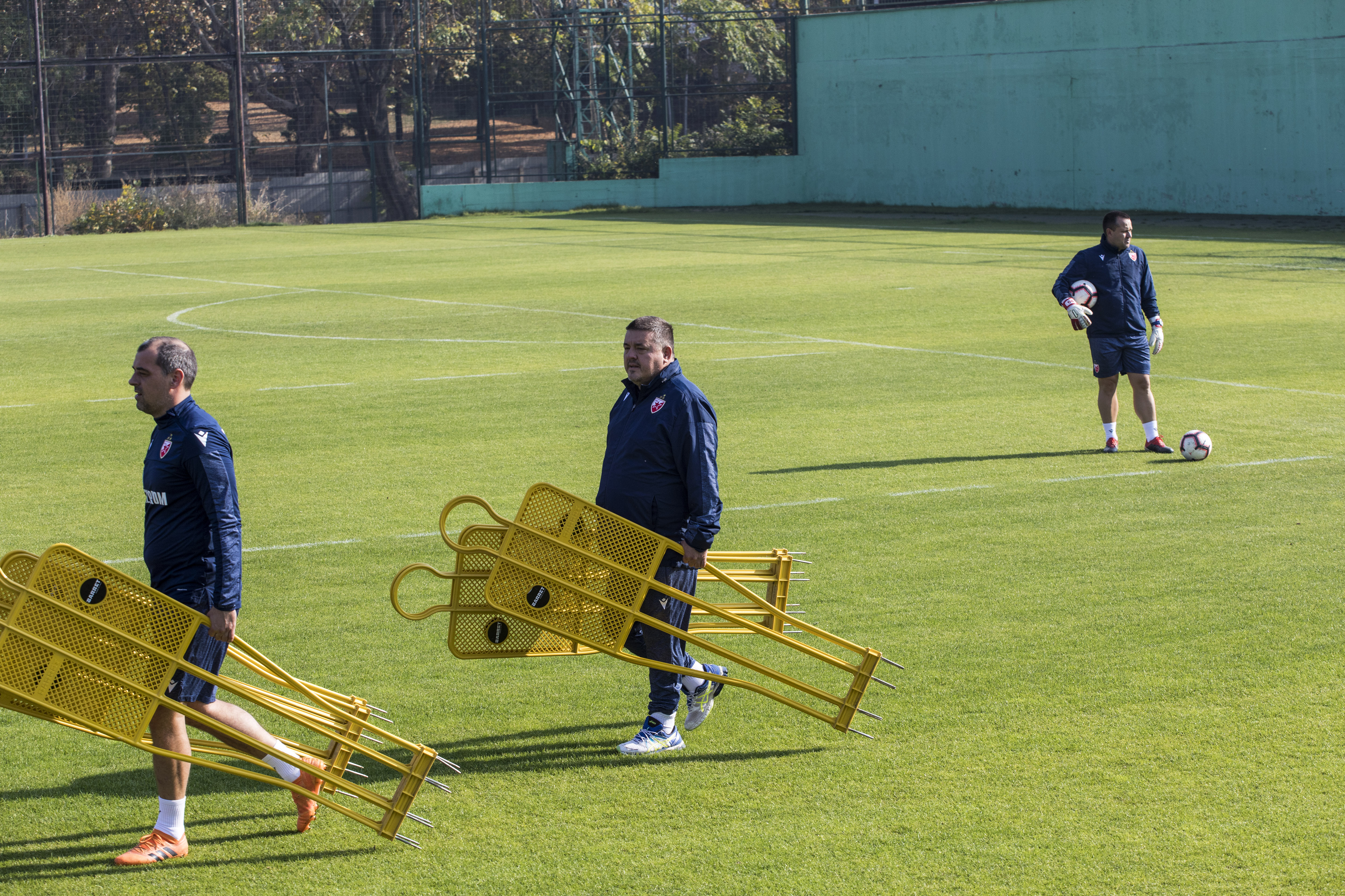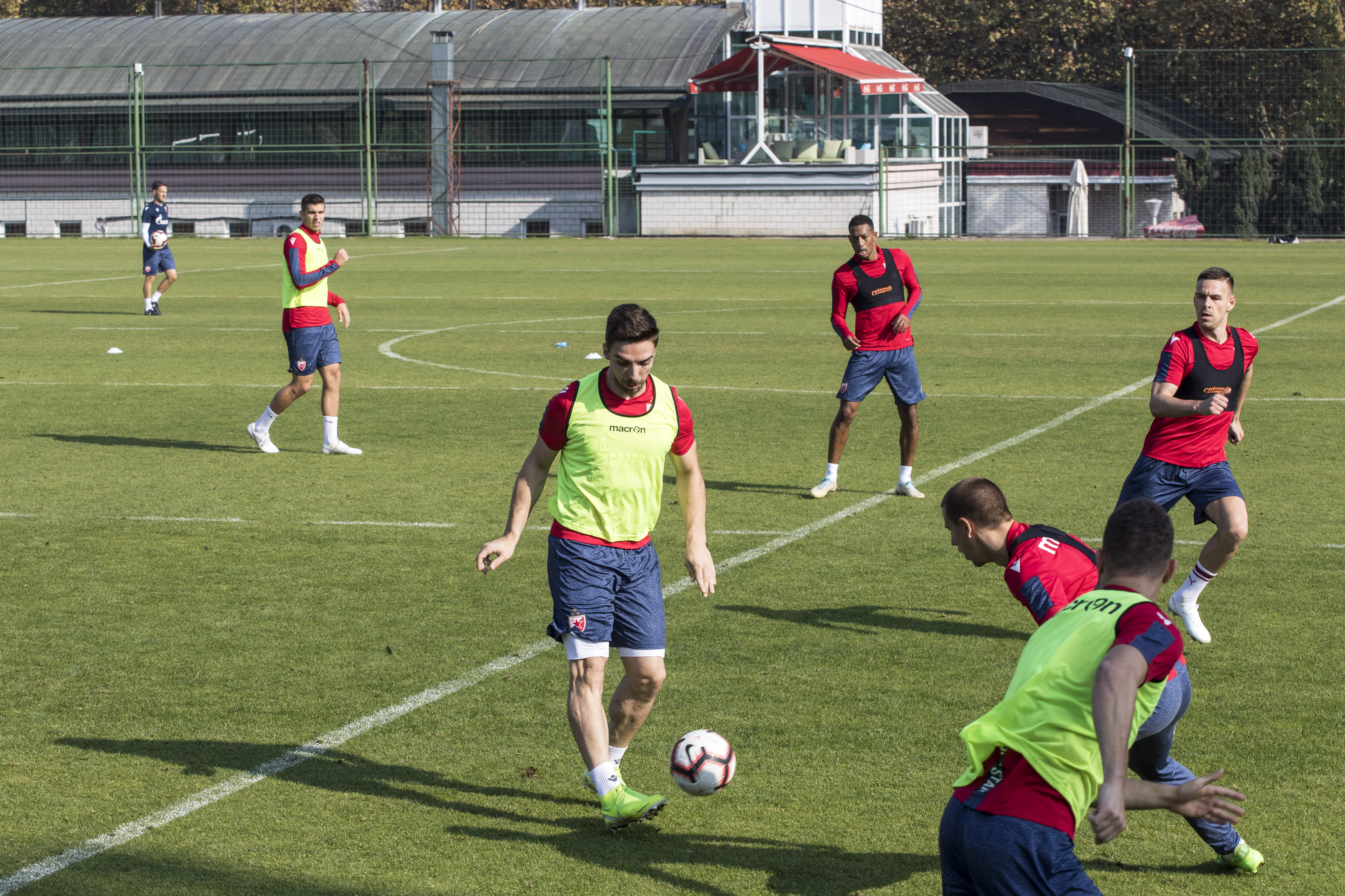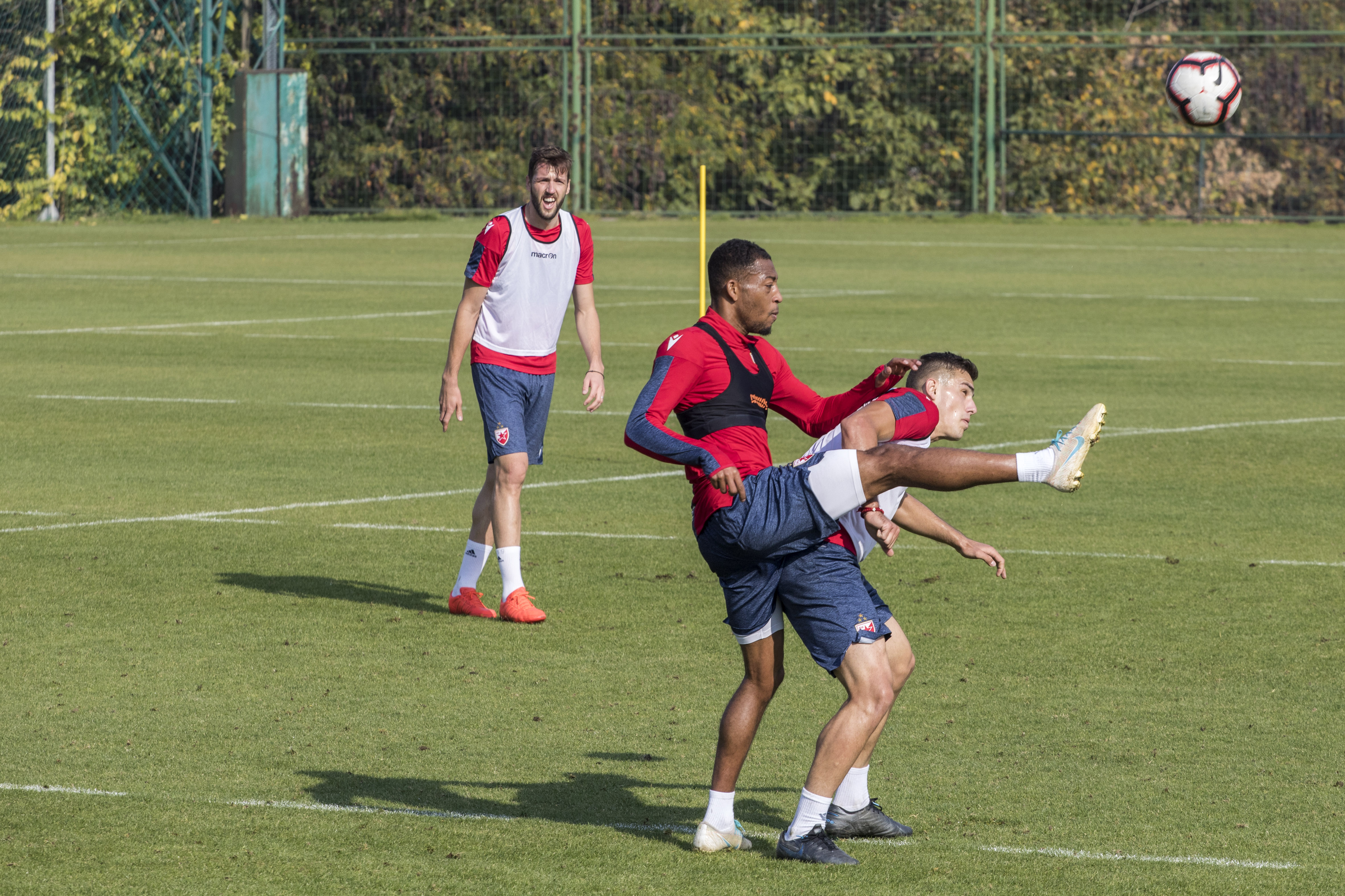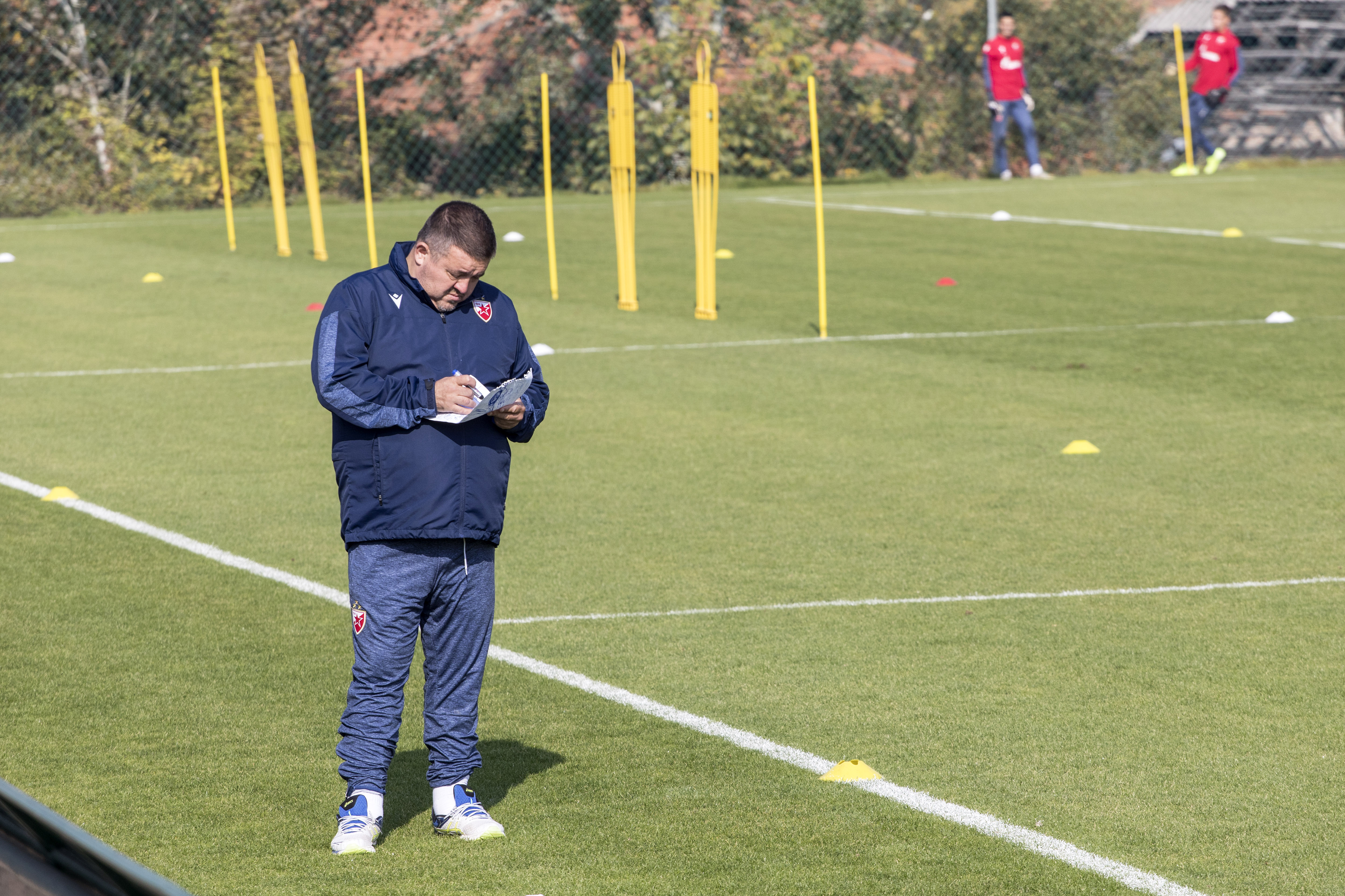 Za to vreme „ljudi u plavim trenerkama“, stručni štab Crvene zvezde predvođen Vladanom Milojevićem, raspoređuju čunjeve, kapice, prepone, štapove i prepreke po iscrtanom pomoćnom terenu.