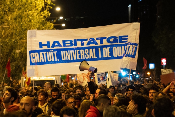 Demonstranti, uz podršku nekoliko levičarskih partija i sindikata, okupili su se u centru Barselone iza velikog transparenta koji poziva na „dostojanstveno stanovanje za sve“.