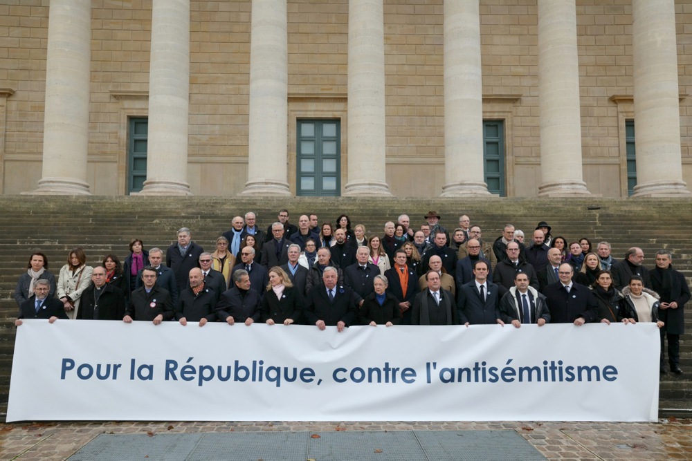 Marš je počeo šetnjom sa ogromnim transparentom „Za Republiku, protiv antisemitizma“ koji nose predsednici oba doma parlamenta.