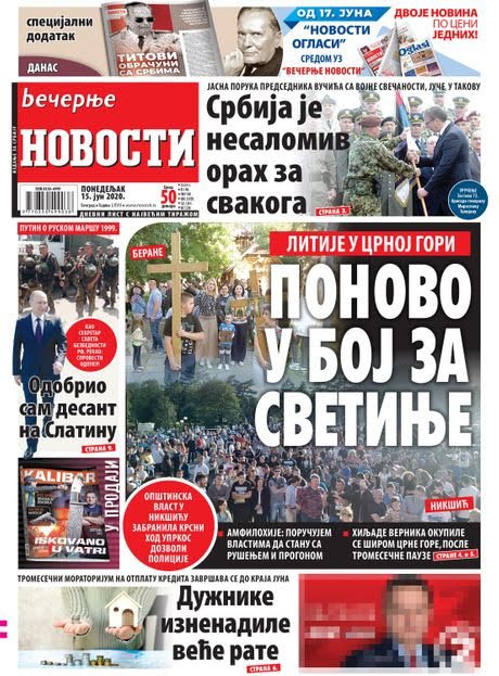 NASTAVLJENE LITIJE ŠIROM CRNE GORE – U Podgorici i nekoliko crnogorskih gradova večeras su nakon tri meseca ponovo održane litije Srpske pravoslavne crkve (SPC) zbog Zakona o slobodi veroispovesti kojim, kako tvrde, crnogorska vlast namerava da im otme svetinje.