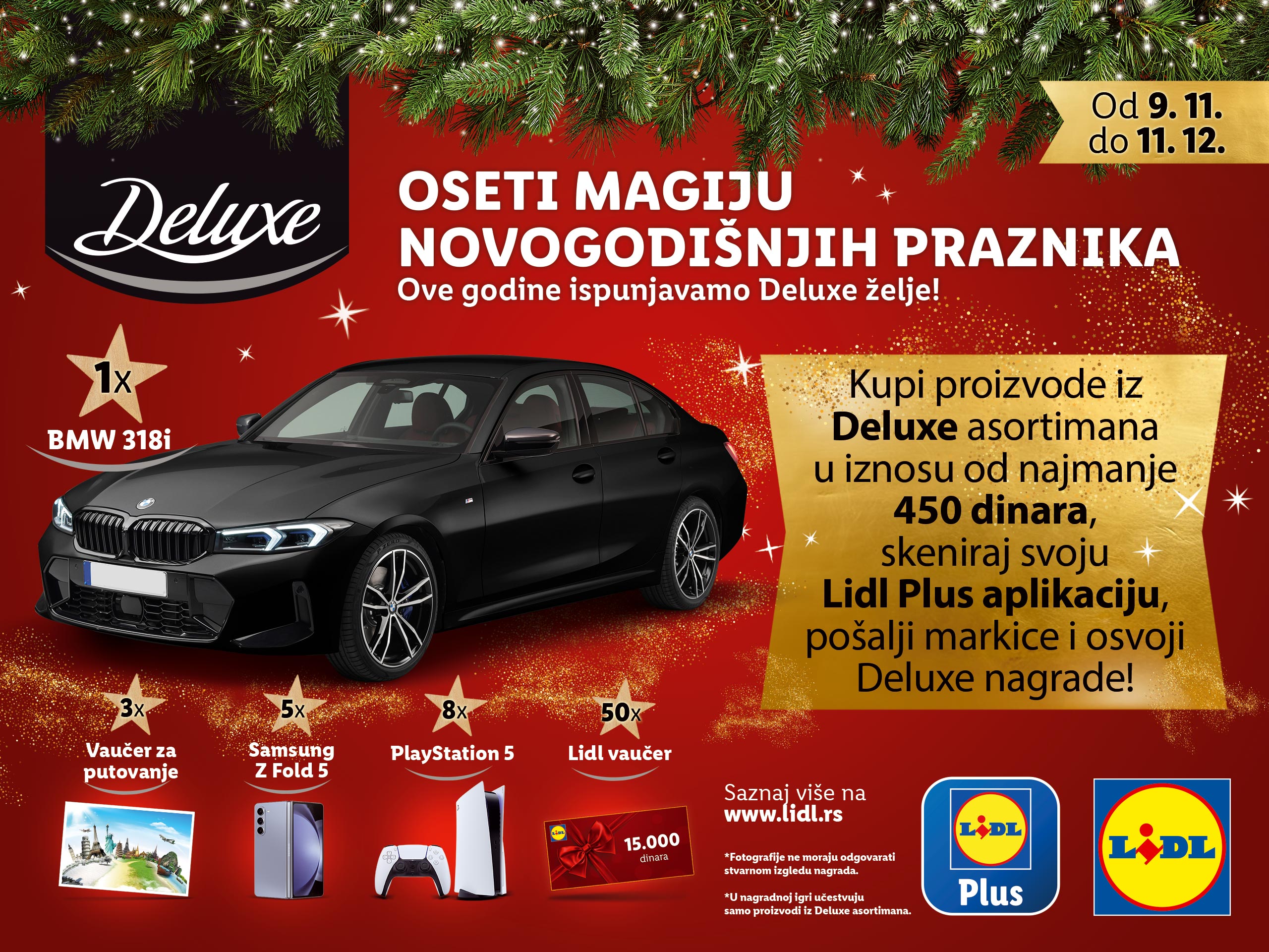 Lidl Srbija i ove godine poziva sve potrošače da učestvuju u Deluxe nagradnoj igri, koja će se sprovesti u periodu od 9. novembra do 11. decembra, i na taj način steknu priliku da osvoje brojne vredne nagrade poput vaučera za putovanje, Samsung Z Fold 5, PlayStation 5 konzole, Lidl vaučera, ali i glavne nagrade – automobila BMW 318i.