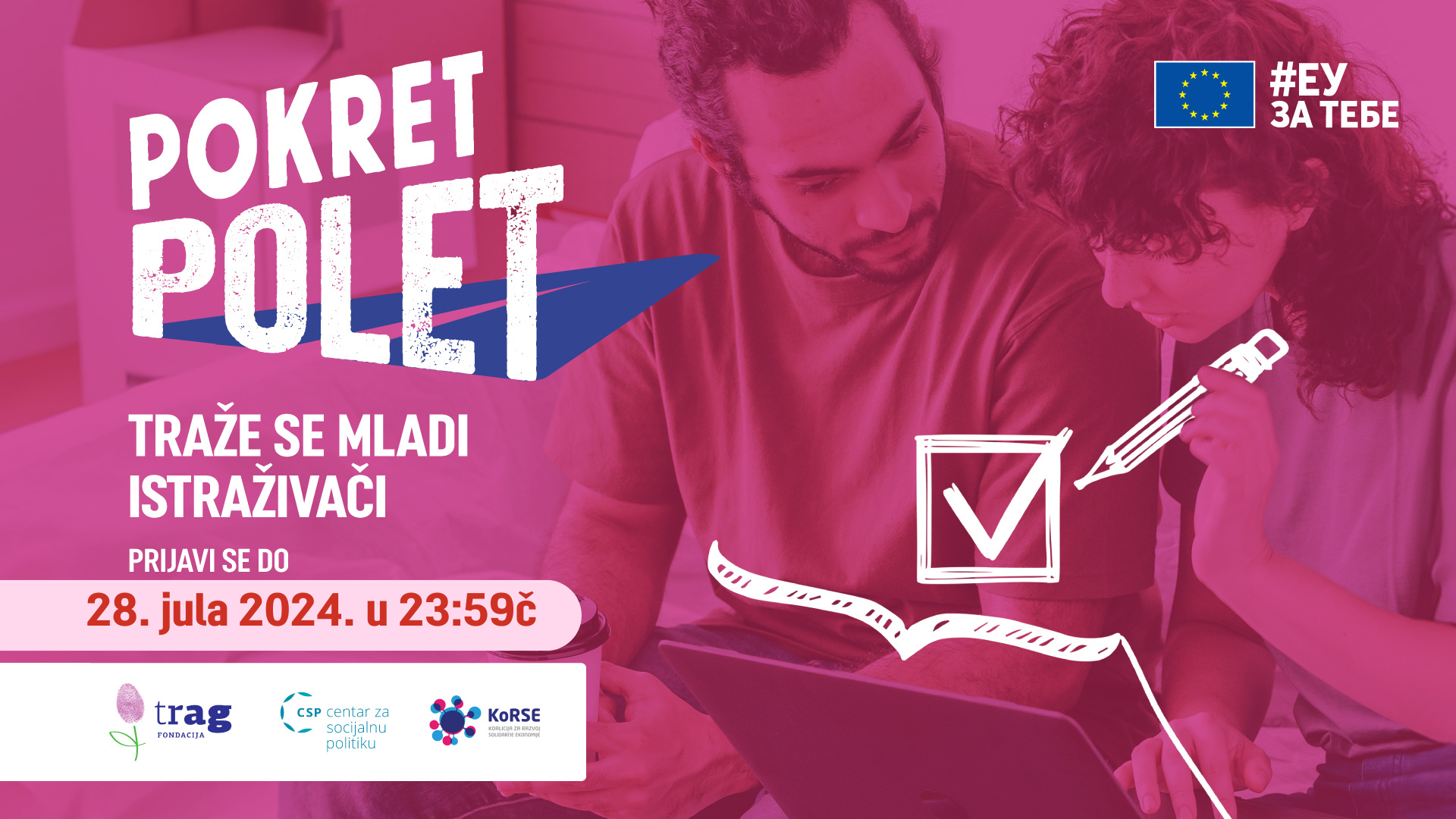 Ako želite da budete deo promena i da kreirate okruženje u skladu sa svojim potrebama – prijavite se. Trag fondacija, u okviru trogodišnjeg programa „Pokret Polet“, objavila je treći konkurs za mlade istraživače/-ice, namenjen akademskim građanima starosti do 30 godina. Program se sprovodi u partnerstvu sa Centrom za socijalnu politiku i u saradnji sa Koalicijom za razvoj solidarne ekonomija (KoRSE), uz finansijsku podršku Evropske unije.