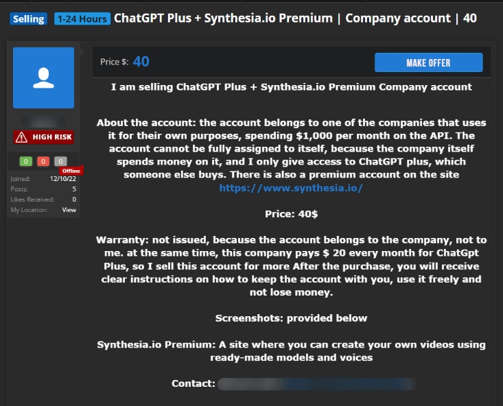 Napadači mogu pristupiti korisničkim nalozima zaposlenih i njihovim podacima preko phishing napada ili korišćenjem ukradenih informacija za prijavu. Štaviše, Kaspersky Digital Footprint Intelligence redovno otkriva postove na Dark web forumima gde se prodaju pristup korisničkim nalozima chatbota.