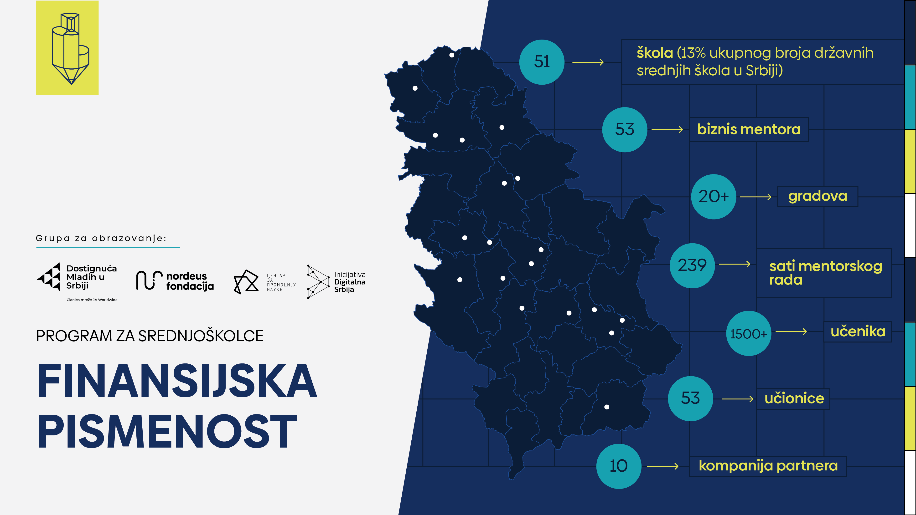 Prošle školske godine, učenici u srednjim školama širom Srbije kroz projekat Finansijska pismenost uz podršku mentora iz šest kompanija imali su priliku da na praktičnim primerima i kroz radionice nauče šta je investiranje, kako se planira kućni budžet, kako funkcionišu banke, krediti, štednja, osiguranje i još mnogo toga. Svesni značaja funkcionalnog znanja, naročito ove vrste pismenosti i njenog uticaja na donošenje kvalitetnijih odluka i budućnost mladih, Grupa za obrazovanje koju čine Dostignuća mladih u Srbiji, Nordeus fondacija, Inicijativa Digitalna Srbija i Centar za promociju nauke, nastavlja sa edukacijom, za još više škola, ovog puta uz podršku 10 partnera iz sektora bankarstva, osiguranja i telekomunikacija.