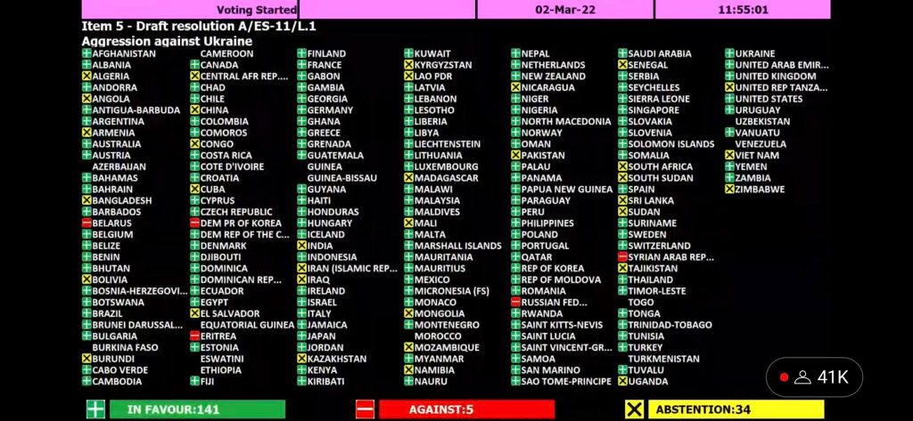 Protiv su bili Rusija, Belorusija, Sirija, Eritreja i Severna Koreja.