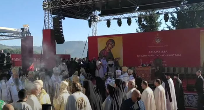 Izveštači javljaju da su građani koji su prisustvovali liturgiji i hirotoniji episkopa budimljansko-nikšićkog nosili trobojke i zastave sa likom Njegoša.