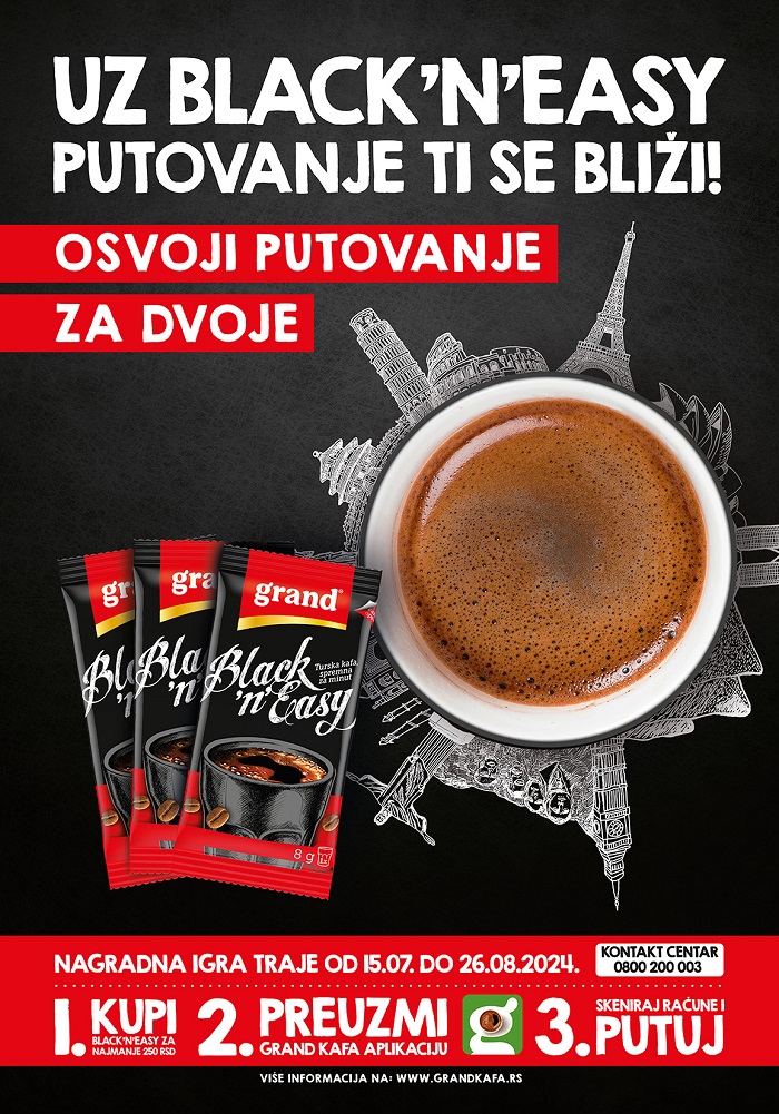Leto je uveliko stiglo, a sa njim i nova nagradna igra „UZ BLACK `N` EASY PUTOVANJE TI SE BLIŽI”! Svi ljubitelji Grand Black‘n’Easy kafe sada imaju priliku da učine ovu toplu sezonu još uzbudljivijom i osvoje vredne nedeljne i dnevne nagrade, kao i onu glavnu – vaučer za putovanje na neku od atraktivnih destinacija u vrednosti od 3000 evra.